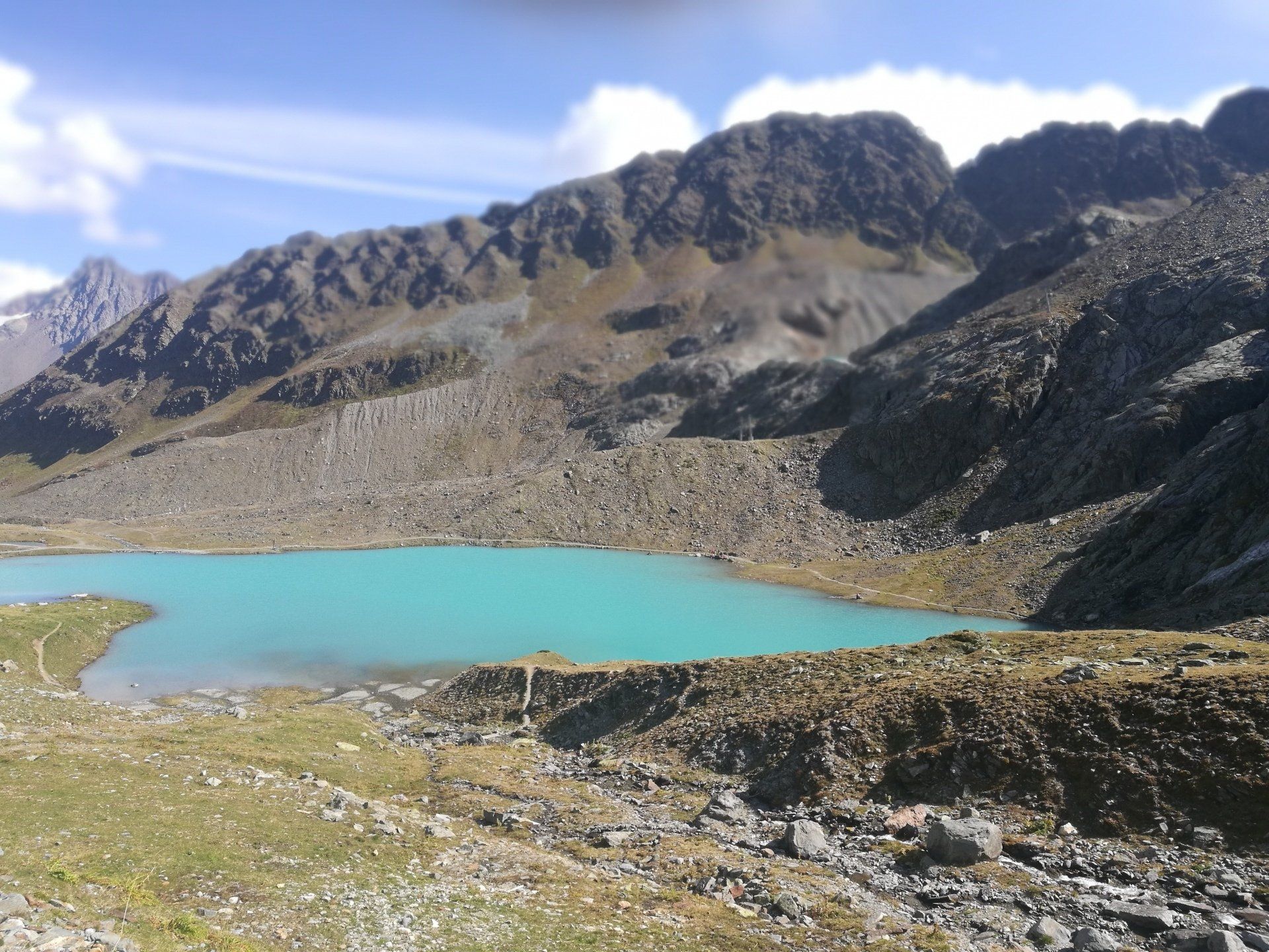 In Susch muss man sich entscheiden. Entweder nach Süden ins Oberengerdin nach Sankt Moritz mit den Pässen, Albula, Julier, Bernina, Majola und Valbella oder gleich Richtung Osten nach Meran. Ich fahre aber zunächst den Flüelapass Richtung Davos. Flüela hat enge Serpentienen und eine Hochebene sowie einen See vor dem Pass zu bieten. In 2383m Höhe hat die Natur Mühe zu überleben, was aber andererseits zu einer für mich faszinierenden kargen Gebirgsgegenden geführt hat. Interessant noch, dass über den Pass auch die Europäische Hauptwasserscheide führt.
