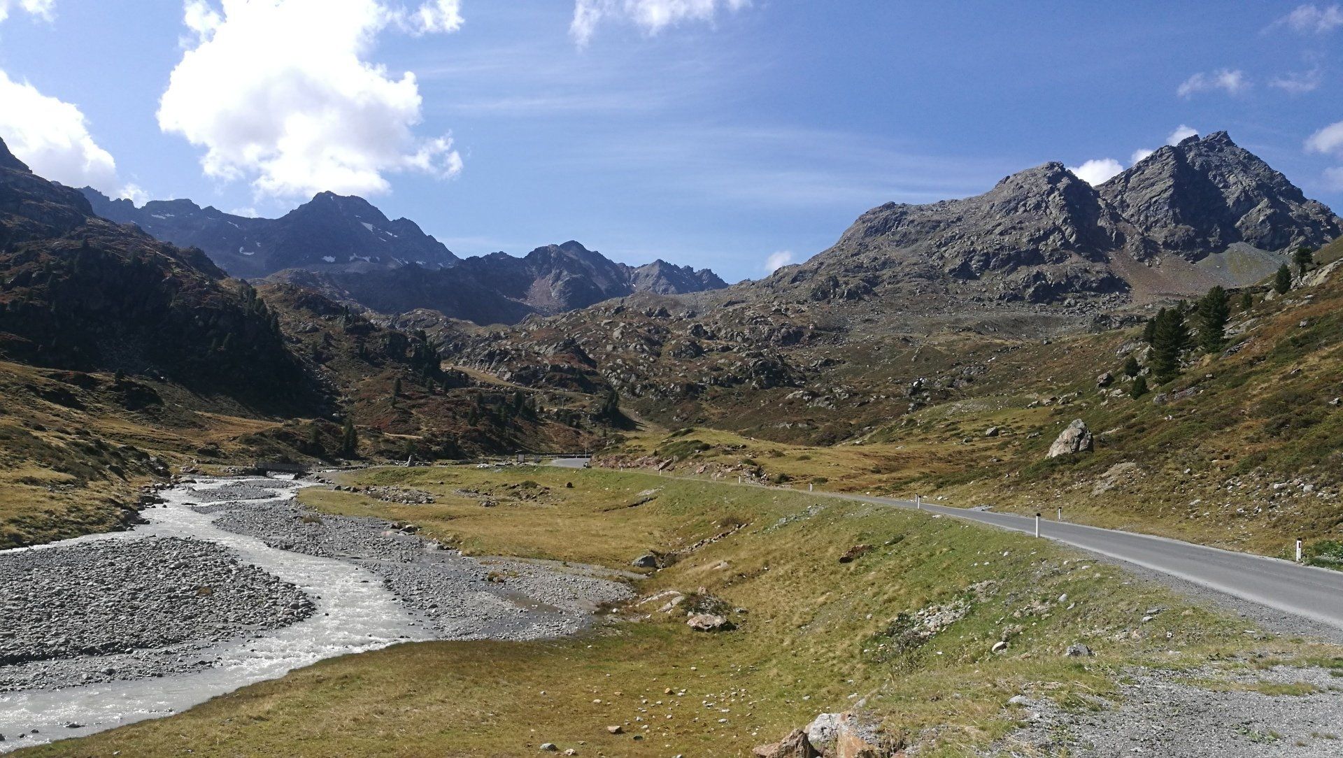 Der Reschenpass ist gesperrt, also geht es ins Inntal Richtung Susch/Davos. Ich mag diese Stecke sehr, sie hat enge und weitgeschwungene Kurven, führt durch enge Flußdurchbrüche des Inns aber auch durch Abschnitte, in denen das Inntal breit und weit offen ist. Immer läßt sich die Straße sehr zügig und flüssig fahren.