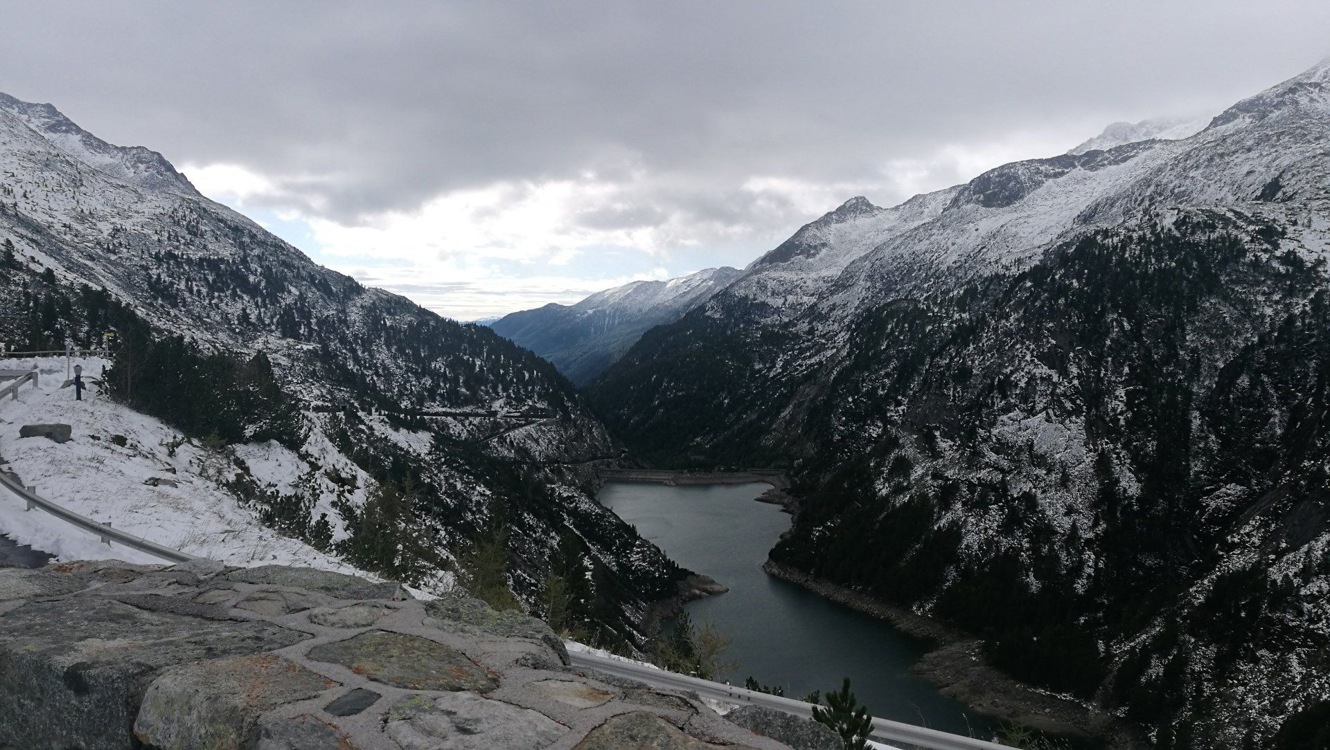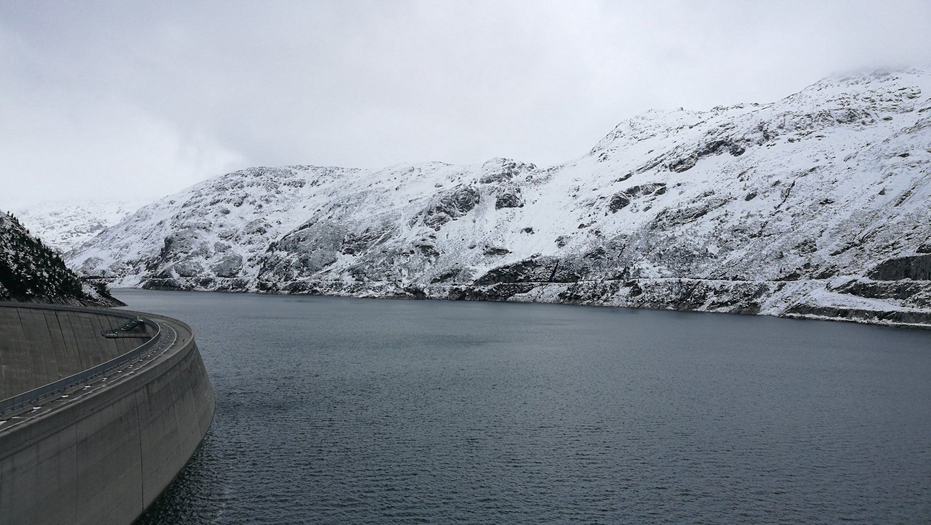 Zunächst werden wir aber erst einmal das Maltatal bis zur Speicher Kölnbrein hinauf fahren. Die Straße ist mautpflichtig, lohnt sich aber zu fahren, vor allem früh Morgens wenn man alle Kurven, Tunnel und den Ausblick auf den Stausee für sich allein hat. Die kalten Farben von Wasser, Schnee, Fels und der eisgraue Himmel erzeugen ein magisches Licht. Mich erinnert das an meine Tour auf der Nordmeerstraße in der Finnmark.